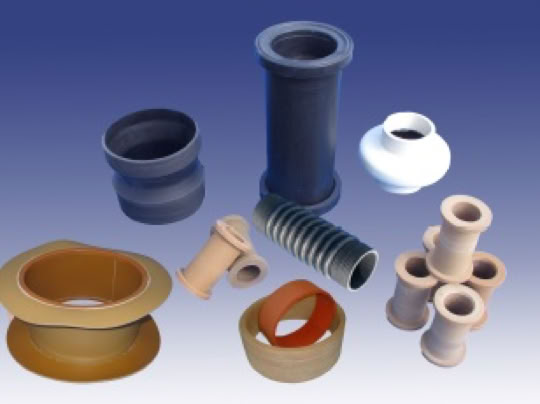 Fabrication de tuyaux hors standards avec : Manchettes renforcées, plis textiles, spires métalliques, robes intérieures toutes qualités Réalisation de pièces confectionnées sur forme de chaudronnerie : à chaud : manchettes, compensateurs, soufflets, joints gonflables… à froid : manchettes confectionnées en tissus de verre enduits de silicone, c/c fluoré, de PTFE, garnissage de goulottes, trémies.