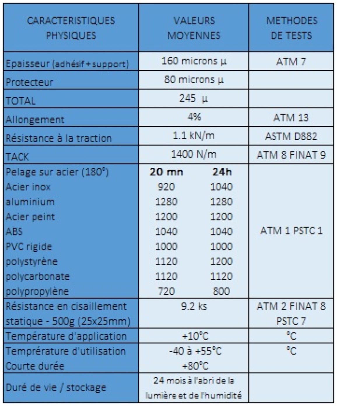 Les caractéristiques données ci-dessus sont basées sur des tests fiables. Néanmoins, les valeurs indiquées sont des valeurs typiques qui varient avec les conditions d'application. Elles ne sont données qu'à titre indicatif, sans aucune garantie. Il incombe à l'utilisateur de vérifier l'adéquation de ce produit à l'usage qu'il souhaite en faire. L'utilisateur est seul responsable des essais préalables et de la préparation de surface de pose de l'adhésif.
