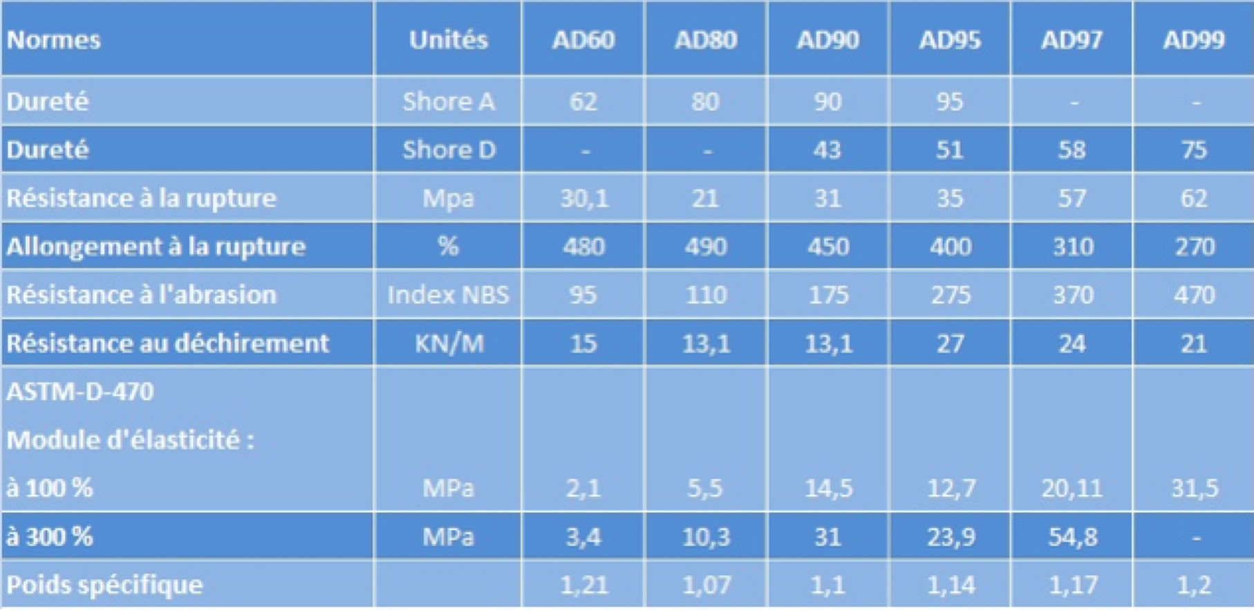 TABLEAU SUR LES CARACTERISTIQUES DU POLYURETHANE